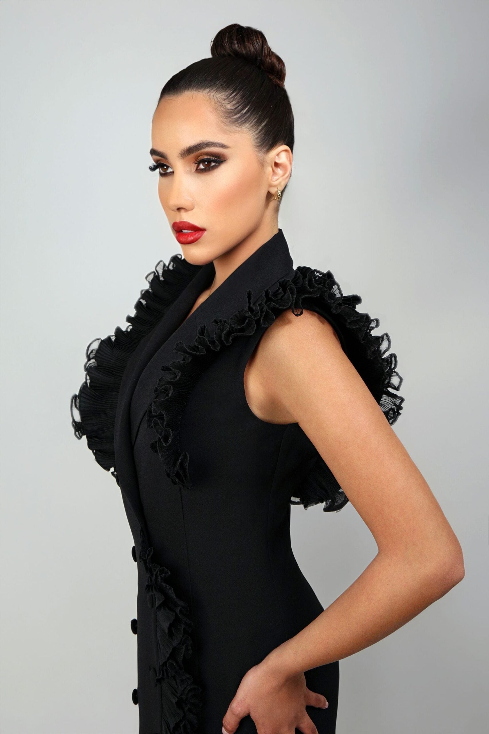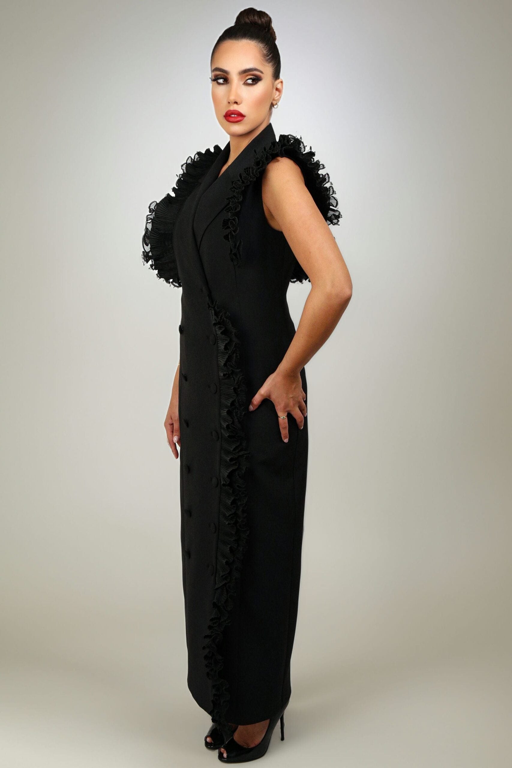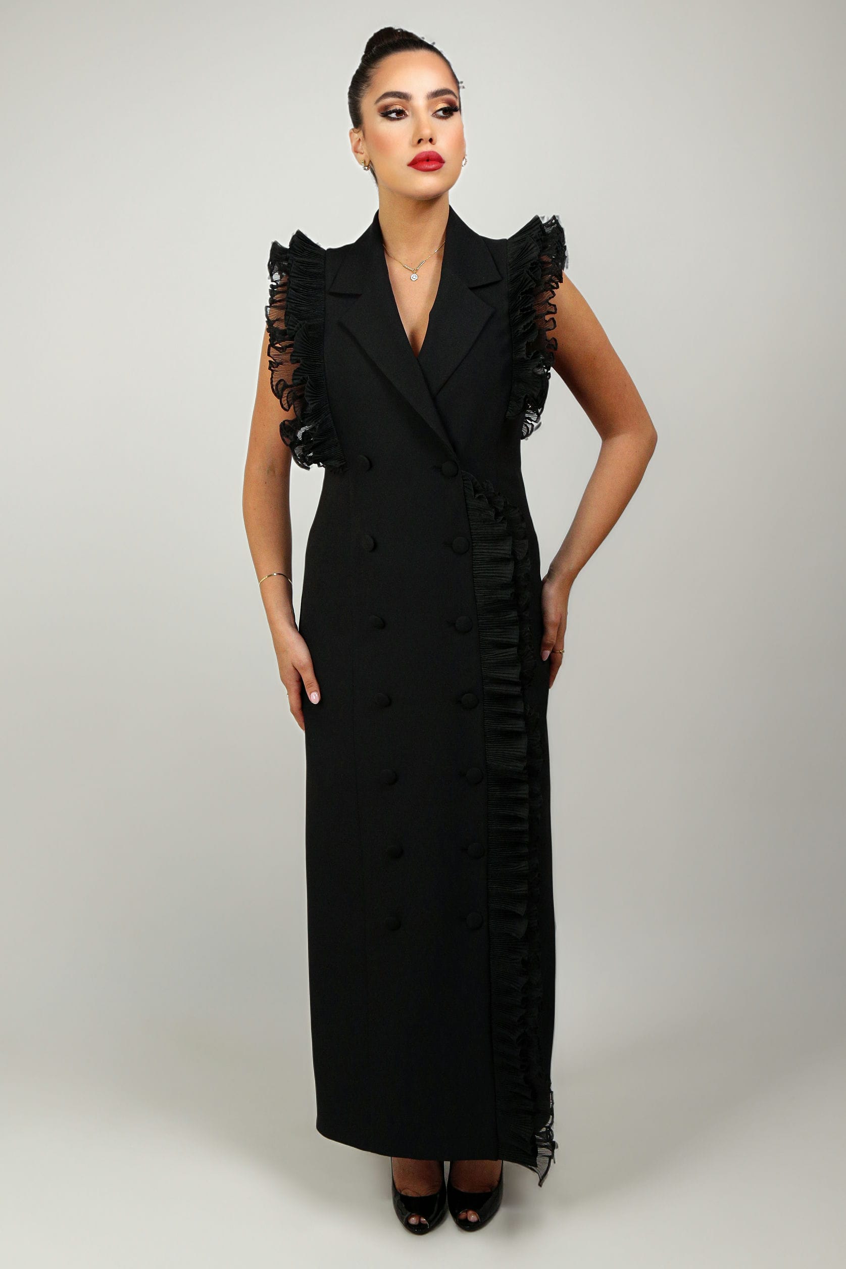 Elevate your wardrobe with our captivating black ruffle dress, a timeless fusion of elegance and flair. Crafted with meticulous attention to detail, this enchanting piece features cascading ruffles that delicately frame the shoulders and down the middle. Whether you're attending a formal event or a stylish soirée, this black ruffle dress is guaranteed to make a statement. Experience the epitome of timeless glamour with our exquisite black ruffle dress, designed to turn heads and leave a lasting impression.